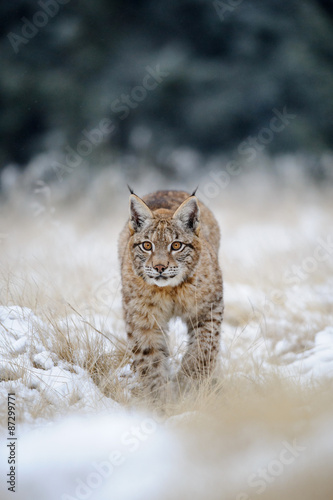 © Stanislav Duben, Naklejka premium Eurasian lynx cub on snowy ground