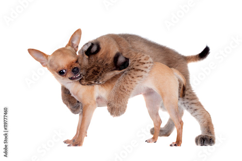 Obraz premium Eurasian Lynx cub with chiahuahua dog