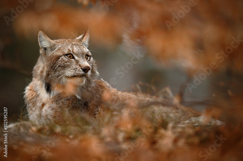Fototapeta premium Eurasian Lynx hidden in orange oak branch duriing autumn
