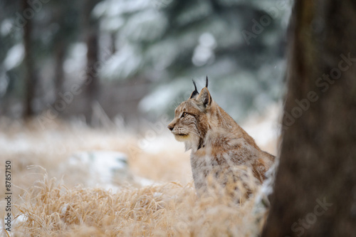 © Stanislav Duben, Naklejka premium Eurasian lynx sitting on ground in winter time on yellow grass
