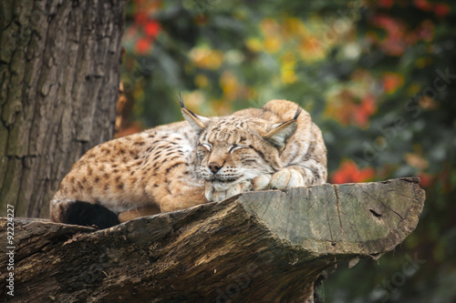 Obraz premium Eurasian lynx sleeping on a tree
