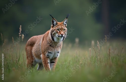 © miss irine, Fototapeta premium Eurasian lynx stands proudly in green meadow. Wild cat mammal with tufted ears hunts in nature. Wild animal in natural habitat at morning time in Finland.
