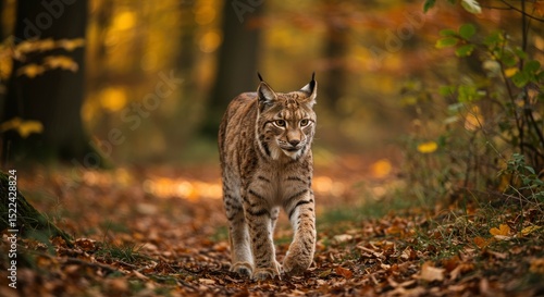 © sakura, Naklejka premium Eurasian Lynx Walking Through An Autumn Forest With Golden Light