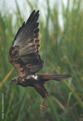 Obraz premium Eurasian Marsh harrier takeoff at Bhigwan bird sanctuary, Maharashtra