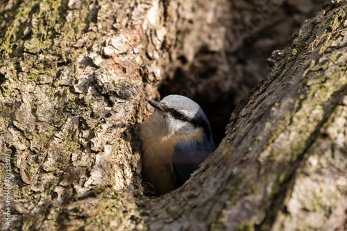 Obraz premium Eurasian Nuthatch, Barrel, Sitta europaea, a bird sings on a branch in the...