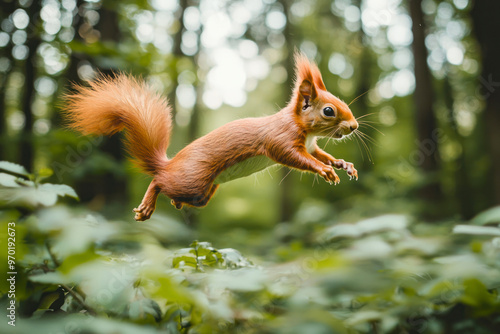 © Hunman, Obraz premium Eurasian red squirrel jumping in the forest.