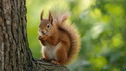 © Giovanni, Obraz premium Eurasian red squirrel perched on a tree branch with a nut, emphasizing natural foraging activity, wildlife photography