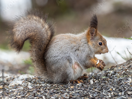 Obraz premium Eurasian red squirrel (Sciurus vulgaris) eating with snow in the background.