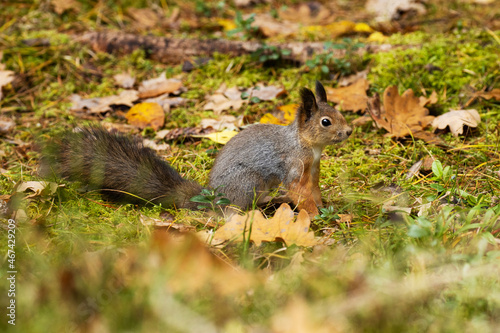 © adamikarl, Fototapeta premium Eurasian red squirrel, Sciurus vulgaris stopping on the ground covered with leaves in Estonian boreal forest.