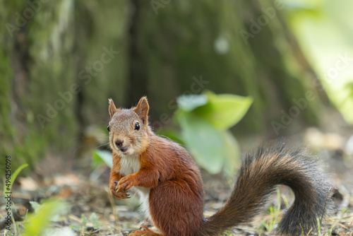 Fototapeta premium Eurasian red squirrel sits under a tree in the forest.