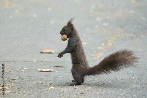 Obraz premium Eurasian red squirrel with walnut in his mouth (Sciurus vulgaris)