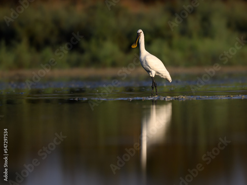 © FotoRequest, Fototapeta premium Eurasian Spoonbill with reflection foraging on the pond in early morning light