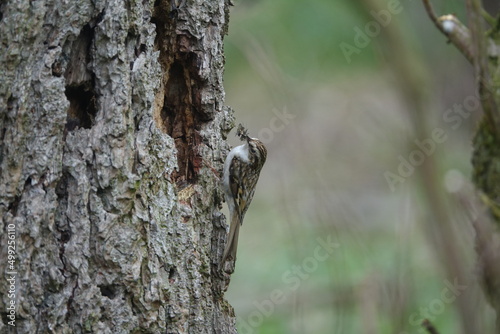 Obraz premium Eurasian treecreeper (Certhia familiaris) approaching nest site concealed behind tree bark