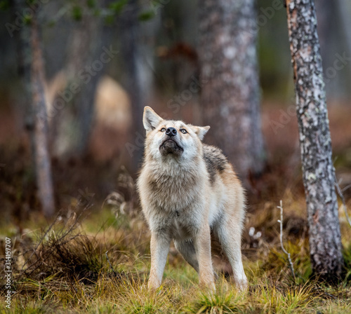 Fototapeta premium Eurasian wolf, also known as the gray or grey wolf also known as Timber wolf. Scientific name: Canis lupus lupus. Natural habitat. Autumn forest..
