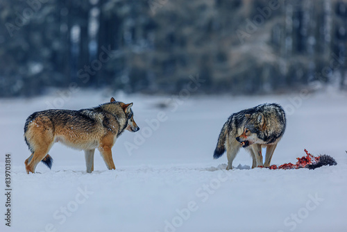 © michal, Naklejka premium Eurasian wolf (Canis lupus lupus) two males fighting for prey in the snow