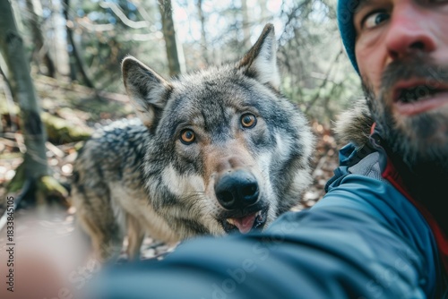 © nsit0108, Naklejka premium Eurasian wolf making eye contact with a wildlife biologist taking a selfie in a natural environment