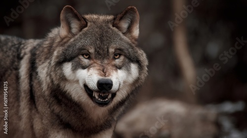 Fototapeta premium Eurasian wolf showing teeth in the forest