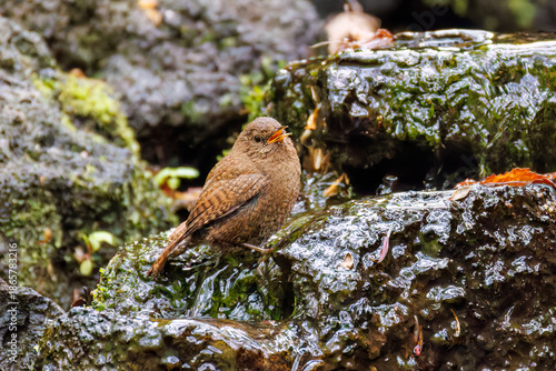 Obraz premium 水浴びするミソサザイ, Eurasian Wren, Troglodytes troglodytes, ミソサザイ科,山梨県富士吉田市大洞の水場-2025 山中湖の別荘地内にある水場。 崖から美しい清水が湧くポイントで、古くから登山者が水を飲んだり、野鳥が水浴びをしたりする。