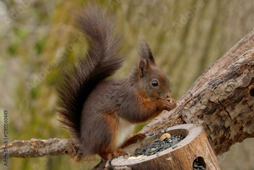 Fototapeta premium Eurasische Eichhörnchen (Sciurus vulgaris) am Futterplatz im Garten