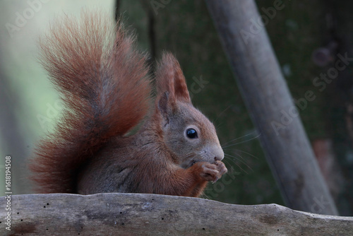 Fototapeta premium Eurasische Eichhörnchen (Sciurus vulgaris) mit Futter