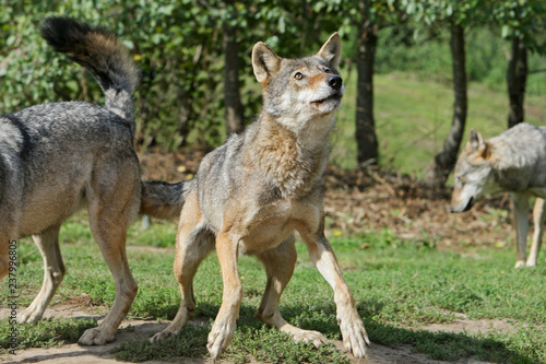 Fototapeta premium Euraziatische wolf kijkt aandachtig omhoog