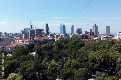 © andrea, Obraz premium Europa, Włochy, Mediolan - widok z lotu ptaka drona na nową panoramę z widokiem na wieżowce z parku Giardini di Villa Reale w centrum miasta po zamknięciu Covid-19 Coronavirus