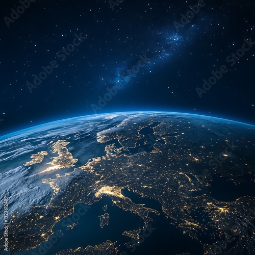 Fototapeta premium Europe at Night A Stunning Satellite View of City Lights and the Milky Way.