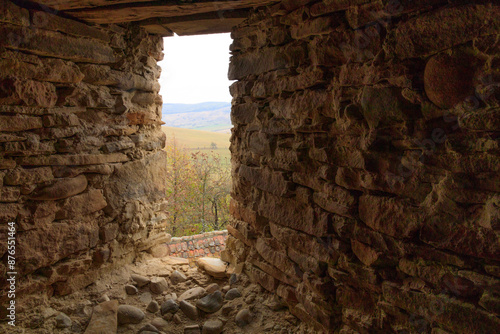 © Emily_M_Wilson, Fototapeta premium Europe, Romania. Viscri. View from stone window in Fortified Church.