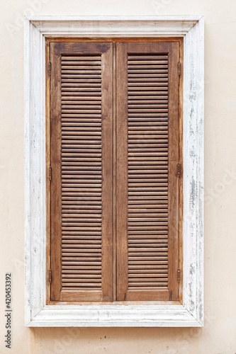 Fototapeta premium European antique brown wooden shutters window and white cement wall