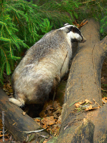 © adventure, Naklejka premium European badger (Meles meles) near tree trunk in forest