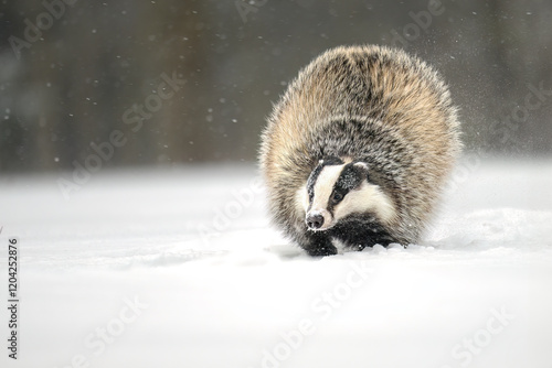 Obraz premium “European Badger Running on a Snowy Clearing at the Forest Edge”