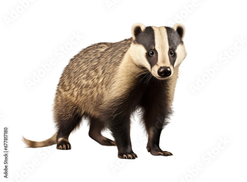 © burntime555, Obraz premium European badger stands side ways and looking to camera. Meles meles Isolated on a white background. Black and white striped forest wild animal close up