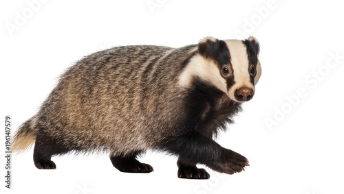 Fototapeta premium European badger with gray fur and black stripes looking forward, isolated on...