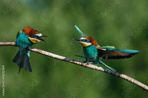© Aleksei Zakharov, Obraz premium European Bee-eater comes in to land on a branch with another bee-eater