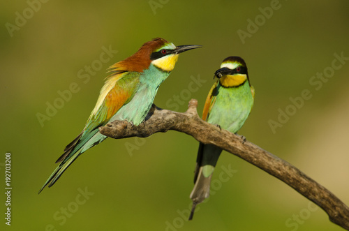 Fototapeta premium European bee-eater, Merops apiaster, colorful birds near their nesting hole,...