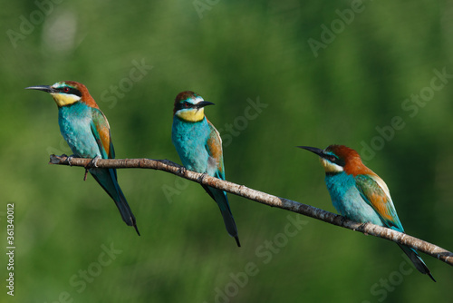 Fototapeta premium European bee-eater, merops apiaster.on Sunny morning, three birds are sitting...