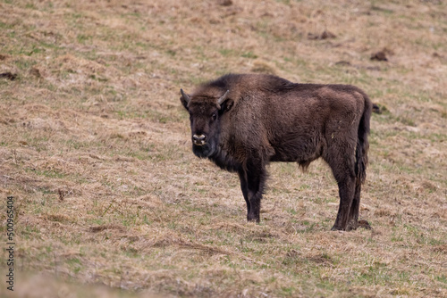 Fototapeta premium European bison (Bison bonasus) is standing on meadow in national park Poloniny