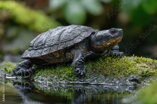 Obraz premium European Bog Turtle Relaxing on a Moss-Covered Rock by Serene Water in a...
