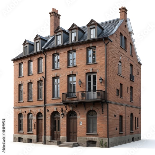 © faiz, Fototapeta premium European brick building with dormers isolated on white background