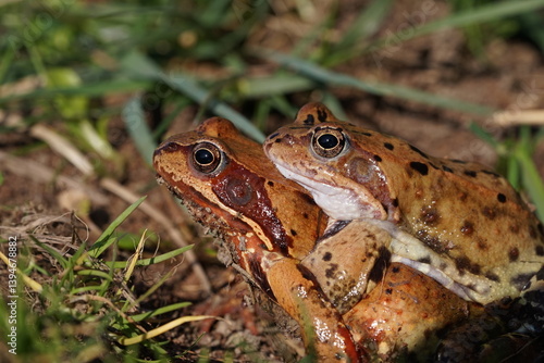Fototapeta premium European brown frog (Rana temporaria) close up mating on spring garden.