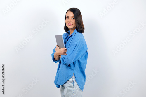 © makedonski2015, Fototapeta premium European brunette woman dressed in a blue blouse holds a laptop and goes to a meeting