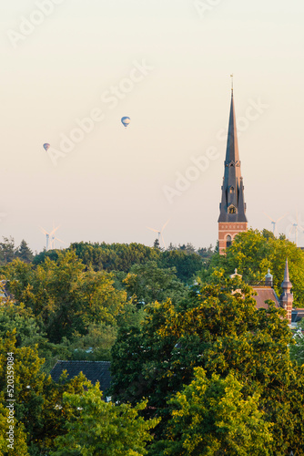 Fototapeta premium European cathedral tower surrounded by green trees at sunset with hot air balloons. Breda, the Netherlands