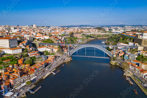 © Leonid, Obraz premium European city Porto with Luis I Bridge over Douro river in Portugal, aerial view