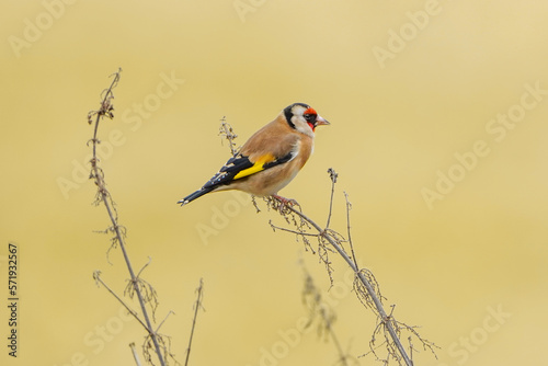 Fototapeta premium European Goldfinch, perched on a plant in a field