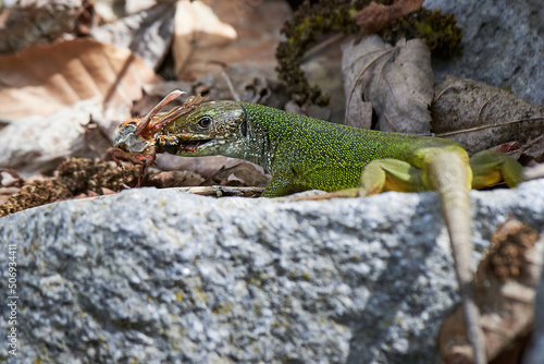 © Adrian , Fototapeta premium European green lizard (Lacerta viridis) feeding with a Cockchafer beetle (Melolontha melolontha)