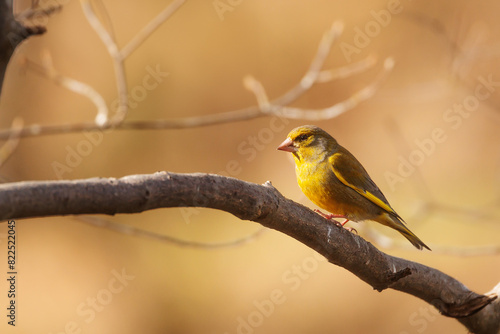 Fototapeta premium European greenfinch,Carduelis chloris on a bush without leaves