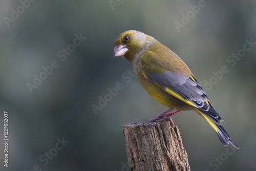 © Erhard Nerger/imageBROKER, Obraz premium European greenfinch (Carduelis chloris), sits on a branch, Emsland, Lower Saxony, Germany, Europe