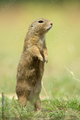 © Simon Vasut, Fototapeta premium European ground squirrel (Spermophilus citellus), with beautiful green coloured background. An amazing endangered mammal with yellow hair in the steppe. Wildlife scene from nature, Czech Republic