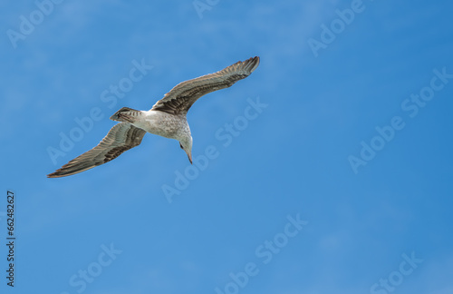 Obraz premium European herring gull in flight looking down at the lagoon with blue skys