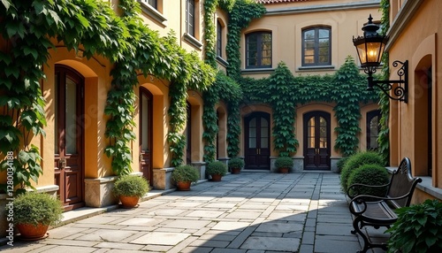 Fototapeta premium European-inspired courtyard with ivy-covered walls and an elegant bench in a...